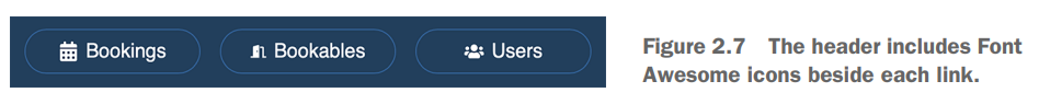 재미잇고 전문적인 회사에서는 회의실, AV 장비, 기술자 시간, 탁구대 등 많은 자원을 직원들이 예약할 수 있다. 어느날 상사가 회사 네트워크를 위한 앱의 뼈대를 설정해 직원들이 자원을 예약할 수 있게 하라고 요구했다. 그림 2.2 처럼 Bookings(예약), Bookables(예약 가능 자원), Users(사용자)라는 세 가지 페이지가 있는 앱을 만들어야 한다.