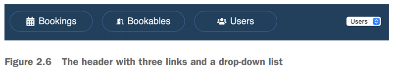 App 컴포넌트는 우리 애플리케이션의 루트 컴포넌트다. 그림 2.6에서 볼 수 있듯이 이 컴포넌트는 링크와 사용자 피커 드롭다운이 포함된 헤더를 표시한다.