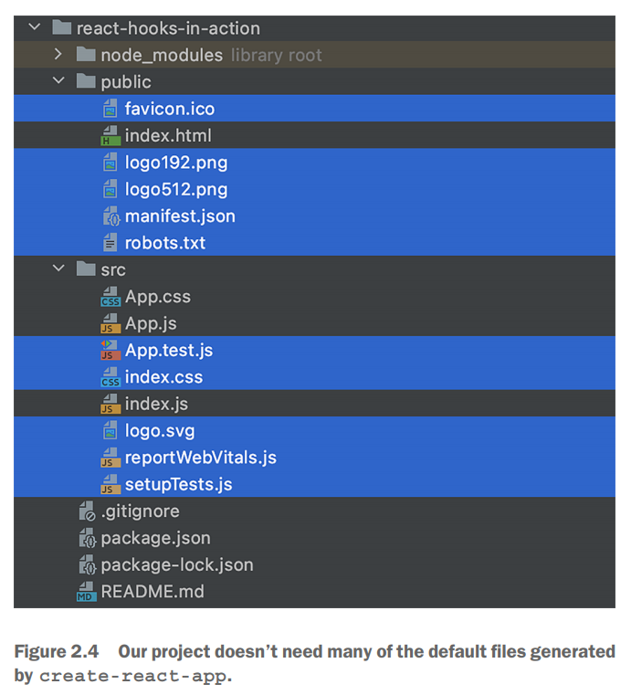 앱에 설치된 파일이 전부 다 필요하지는 않기 때문에 파일을 몇 개 빠르게 삭제하자. react-hooks-in-action 폴더 내부의 public 폴더에서 index.html을 제외한 모든 파일을 제거하라. src 폴더에서는 App.css, App.js, index.js만 남기고 모든 파일을 제거하라. 그림 2.4는 제거해야 할 파일을 강조해 보여준다.