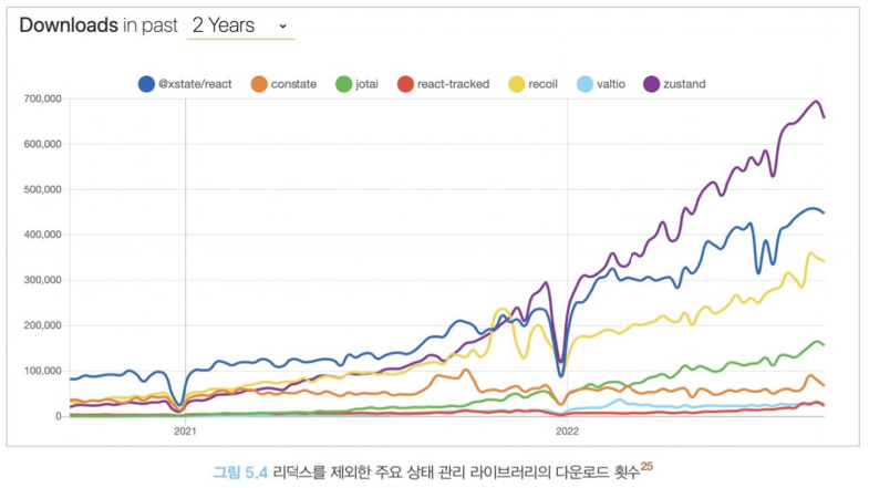 - 한 가지 더 중요한 점은 npm에서 제공하는 모든 라이브러리와 마찬가지로 메인테이너가 많고 다운로드가 활발하며 이슈가 관리가 잘되고 있는 라이브러리를 선택하는 것이 좋다는 사실이다. 이후 10.2절 '리액트 18버전 살펴보기'에서 살펴볼 리액트에서의 변화로 인해 일부 상태 관리 라이브러리에도 변경이 필요해졌다. 비단 18 버전 때문만이 아니더라도, 향후 리액트의 방향성에 따라 상태 관리 라이브러리도 리액트 변화에 발맞춰 꾸준히 대응해 줄 필요가 있다. 만약 이러한 대응이 원활하지 않은 라이브러리를 선택한다면 애플리케이션의 장기적인 유지보수 및 개선에 어려움이 있을 수 있다. 여기에서 언급한 세 라이브러리는 모두 다운로드 순위에서도 봤듯이 제법 상위권에 포진해 있고, 훌륭한 메인터이너를 위시로 유지보수되고 있으니 사용하는 데 크게 어려움이 없을 것으로 보인다.