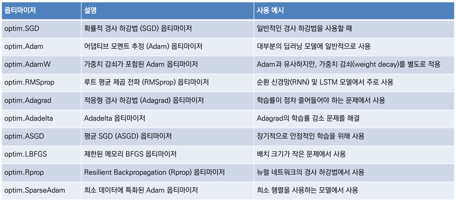 - PyTorch의 옵티마이저