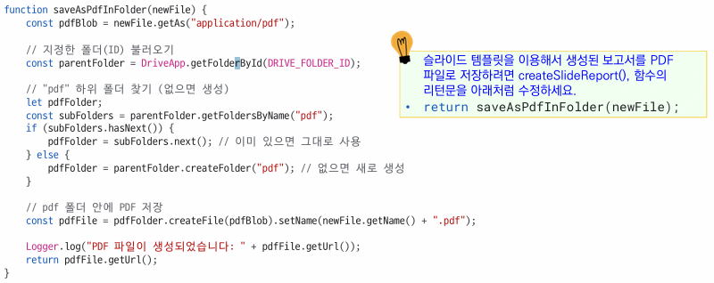 Logger.log("Google 슬라이드 보고서가 생성되었습니다: " + newFile.getUrl());