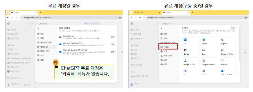 - ChatGPT 커넥터는 유료 계정만 사용 할 수 있습니다