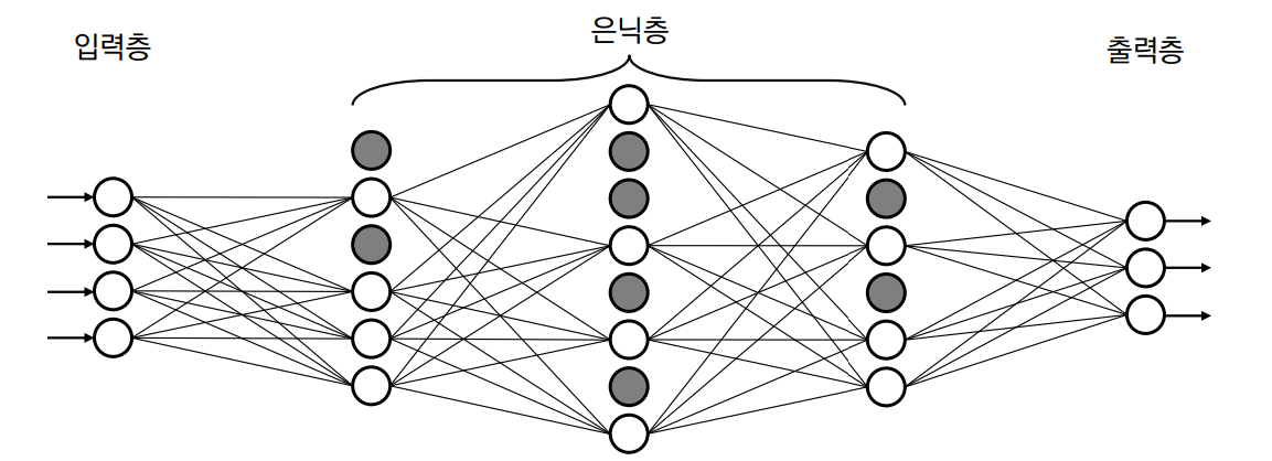드롭아웃(Dropout)은 인공신경망의 일부 뉴런이 학습하지 않도록 하는 것입니다.