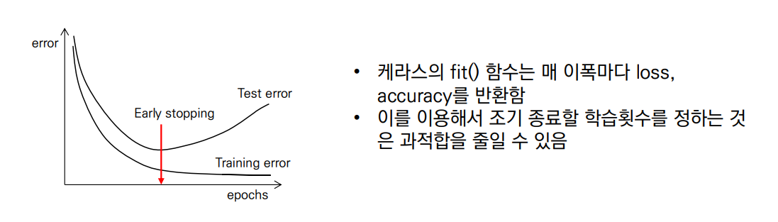 케라스의 fit() 함수는 매 학습(epoch)마다 loss와 accuracy를 계산한 값을 반환합니다. 이를 이용해서 조기 종료할 학습횟수를 정하는 것은 과적합을 줄일 수 있는 빠른 방법입니다.