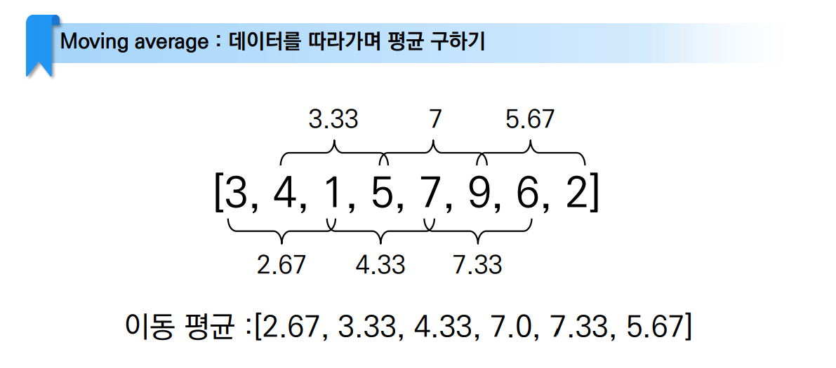 - 합성곱(컨볼루션; Convolution)을 설명하기 위해 이동평균(Moving Average)을 먼저 설명해 보겠습니다. 이동평균은 데이터를 따라가며 평균을 구하는 것을 의미합니다.