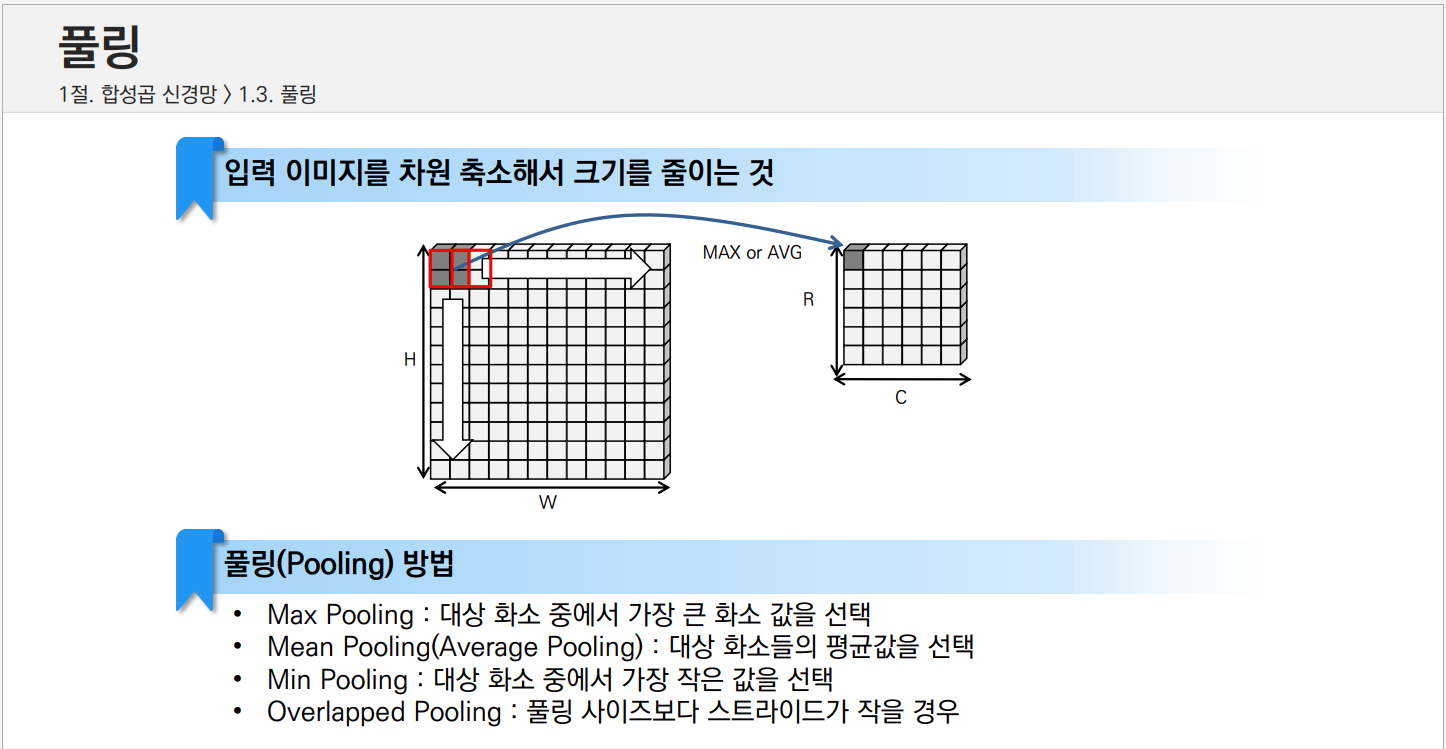 - CNN에서 합성곱 계층을 통과한 데이터는 차원축소 과정을 통해 이미지의 크기를 줄이게 됩니다. 입력 이미지를 차원 축소해서 크기를 줄이는 것을 풀링(Pooling) 이라고 합니다.