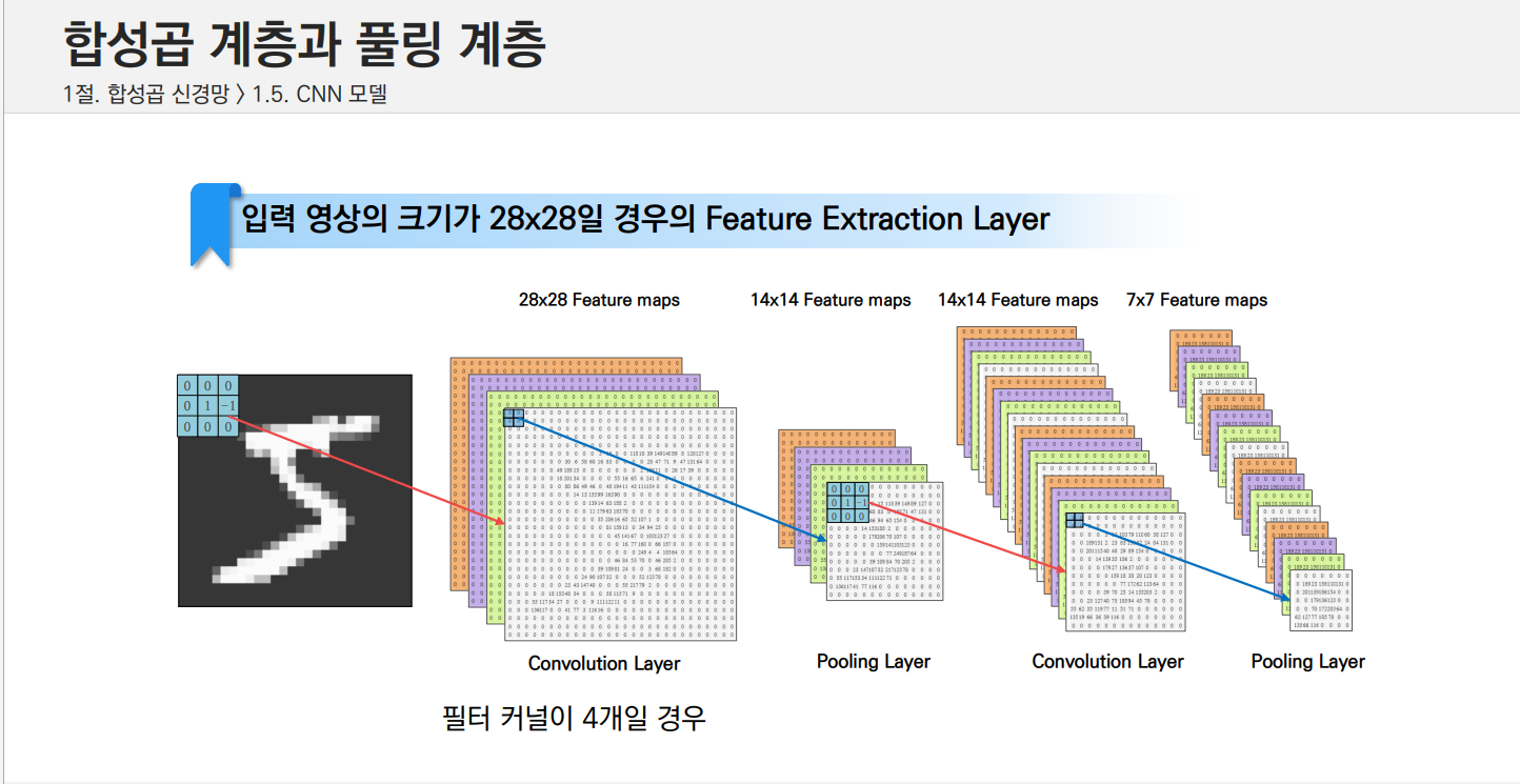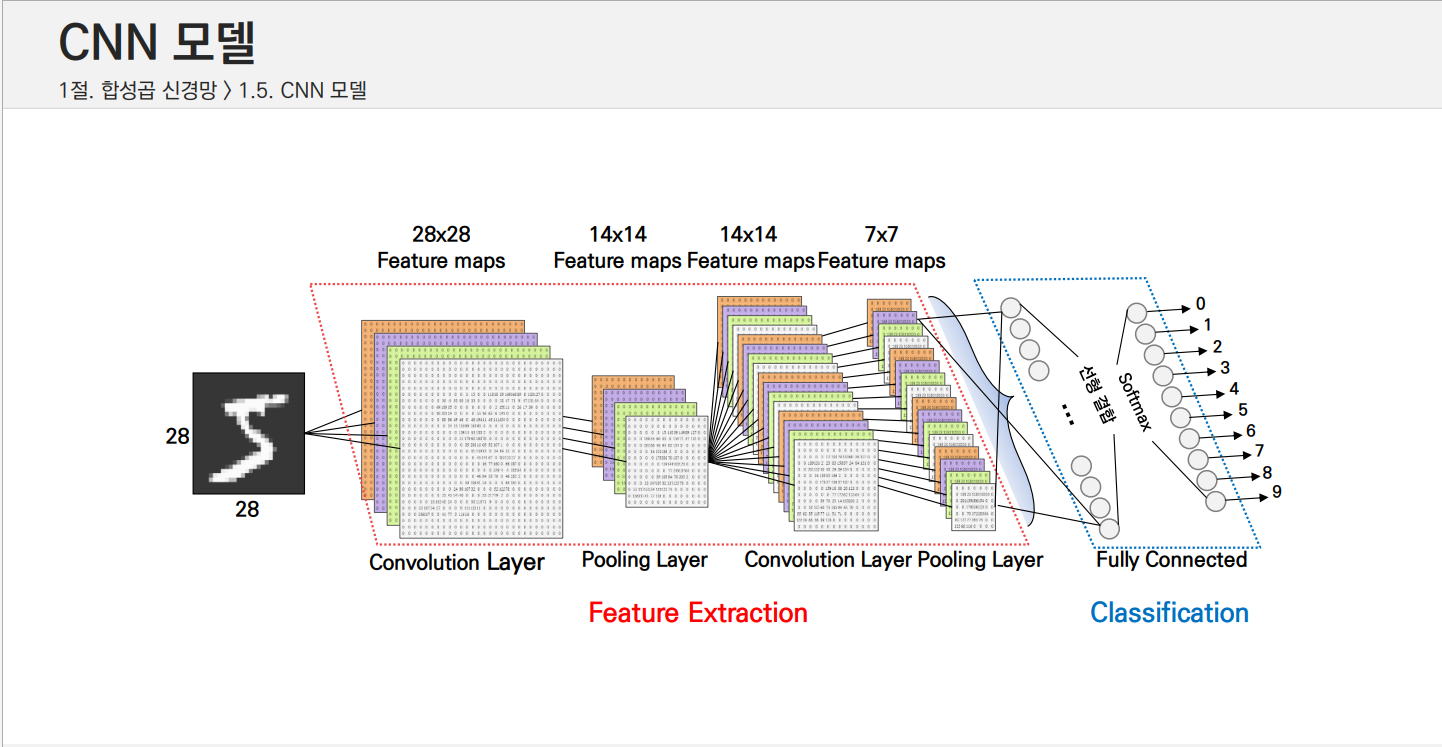 - 합성곱 계층과 풀링 계층에서의 필터는 이미지의 특징을 더 잘 표현할 수 있는 방향으로 학습됩니다. 다시 말하면 인공신경망의 학습 과정에서 입력 이미지의 특징을 더 잘 표현할 수 있도록 필터가 학습으로 만들어진다는 의미입니다. 그래서 합성곱과 풀링을 포함한 계층을 특징 추출(Feature extraction) 계층이라고 합니다.