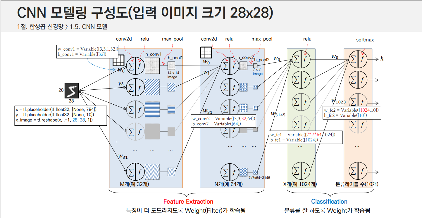 - 다음 그림은 MNIST 데이터를 분류하기 위한 CNN 모델링 구성도 입니다. 모든 선을 표시하면 구성도가 너무 복잡해지므로 이전 층의 출력이 다음 층의 입력으로 표현하는 선의 일부를 생략했습니다.