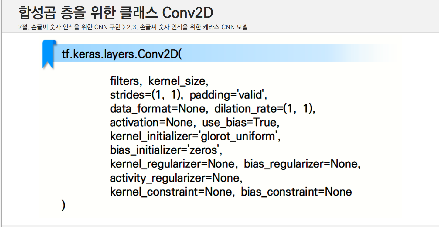 - 케라스의 Conv2D 클래스는 2D 이미지를 합성곱하기 위한 레이어를 만들어줍니다.