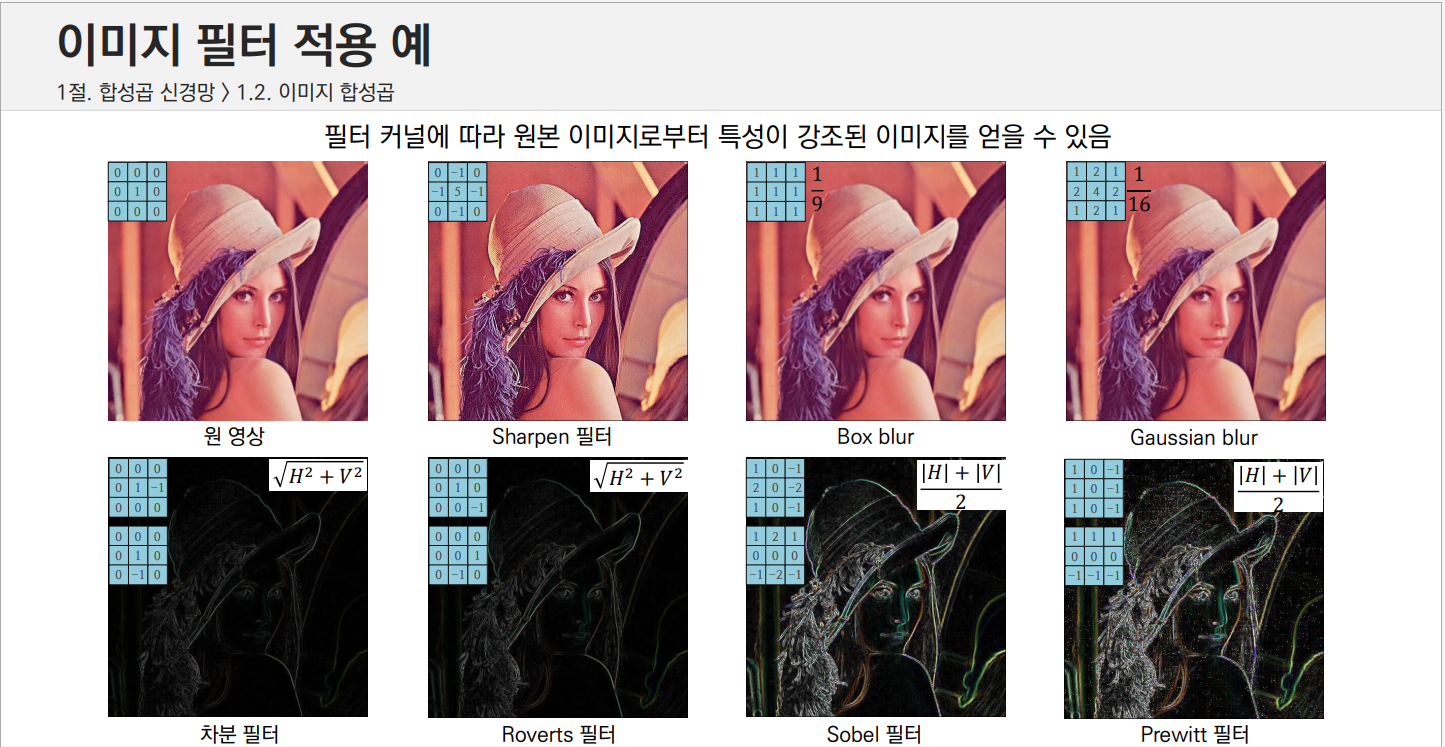 - 위의 그림은 원본 영상에 필터 처리를 한 영상들의 예를 보여줍니다. 때로는 x축과 y축에 약간 다른 필터를 적용하여 영상에서 경계선(에지) 영역만 추출할 수도 있습니다. 이렇게 필터를 적용하면 필터 행렬의 특성에 따라 원본 이미지로부터 특성이 강조된 이미지를 얻을 수 있습니다.