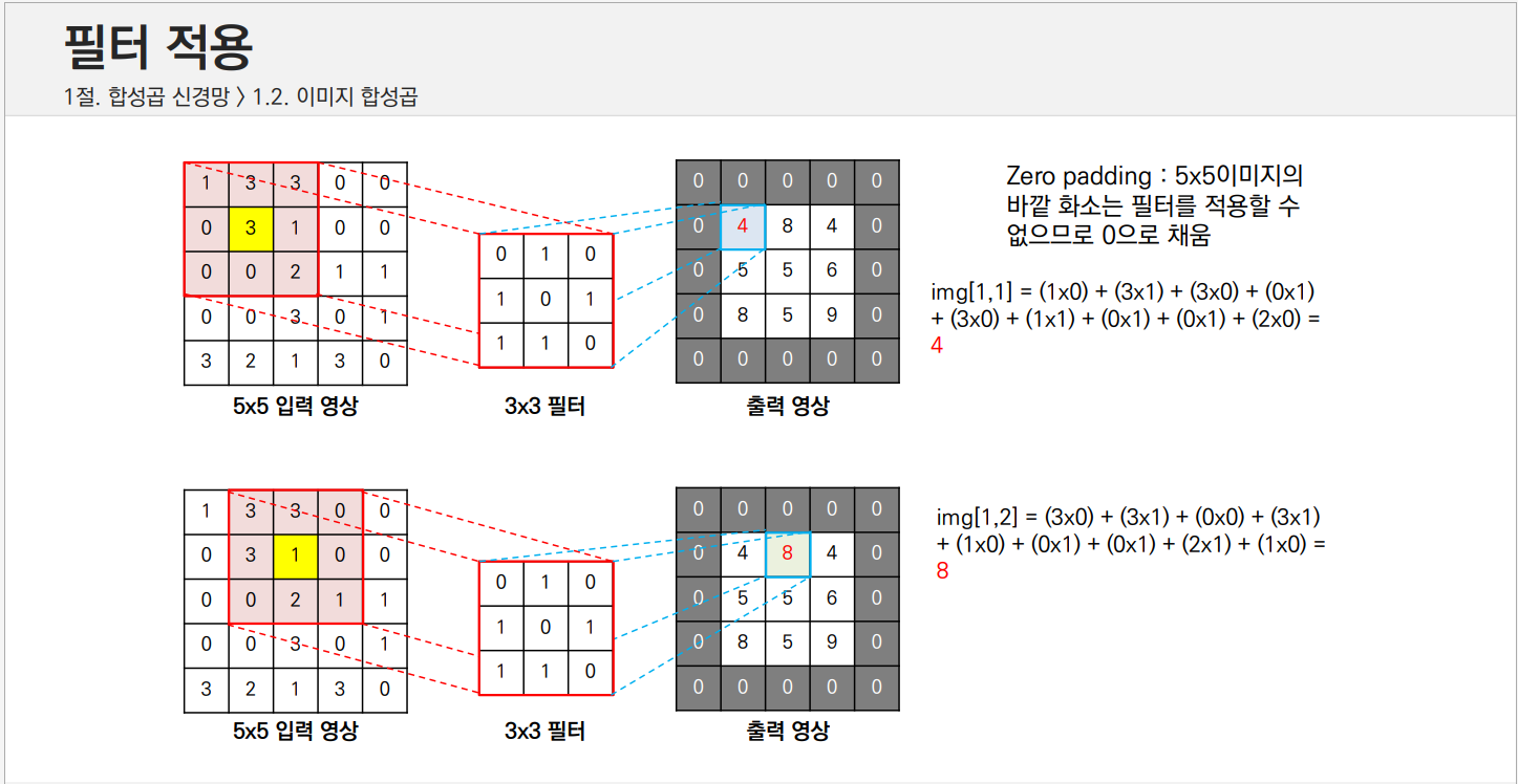 - 이런 방법으로 모든 화소에 대해 합성곱을 수행하면 필터를 적용한 결과를 얻게 되는 것입니다.