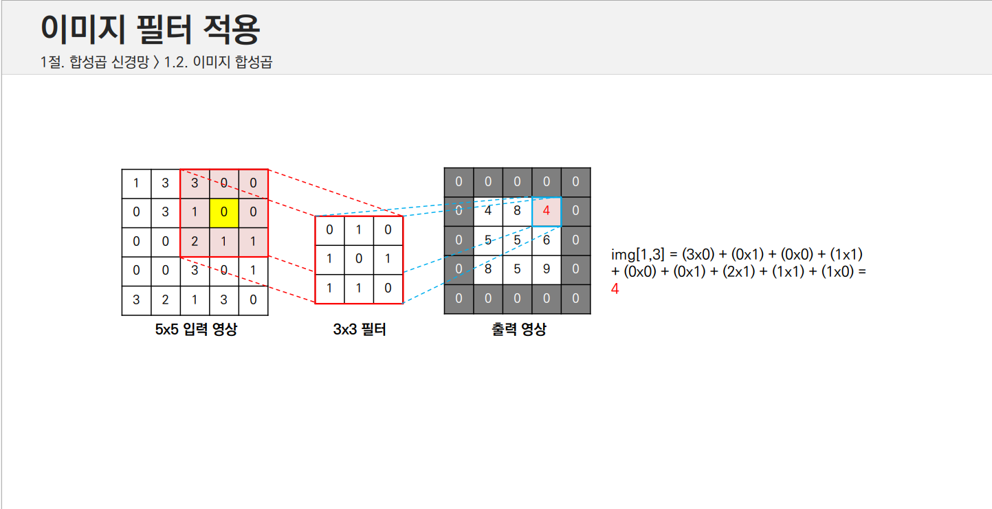 - 다음 5x5 이미지 배열에 3x3 크기 필터를 이용해서 합성곱을 수행하면 img[1,1]의 출력 화소의 값은 다음 식을 통해 계산됩니다.