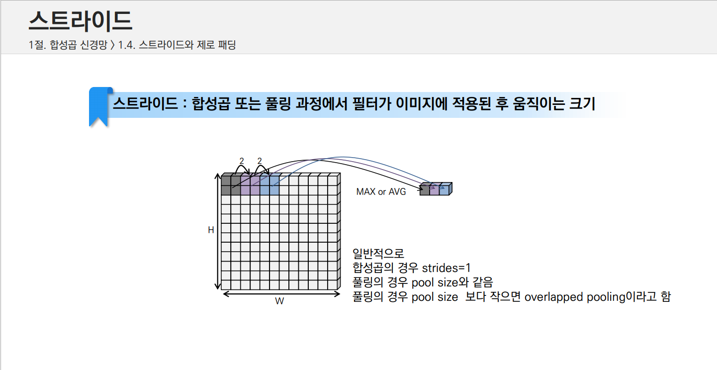 - 합성곱 또는 차원 풀링 과정에서 필터 커널이 원 이미지에 적용된 후 움직이는 화소의 크기를 스트라이드(stride)라고 합니다.