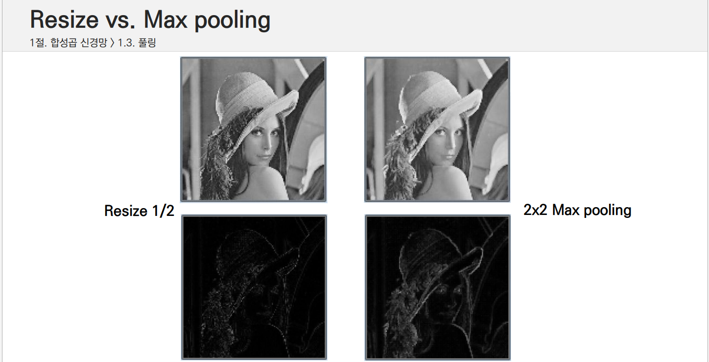 - 맥스 풀링은 엣지(Edge, 경계선 또는 윤곽선) 영상 등 특징을 추출해 저장한 이미지의 경우 엣지가 더 뚜렷해지는 효과가 있습니다. 그래서 CNN에서 차원을 줄이고 특징을 강조하기 위해 사용합니다.