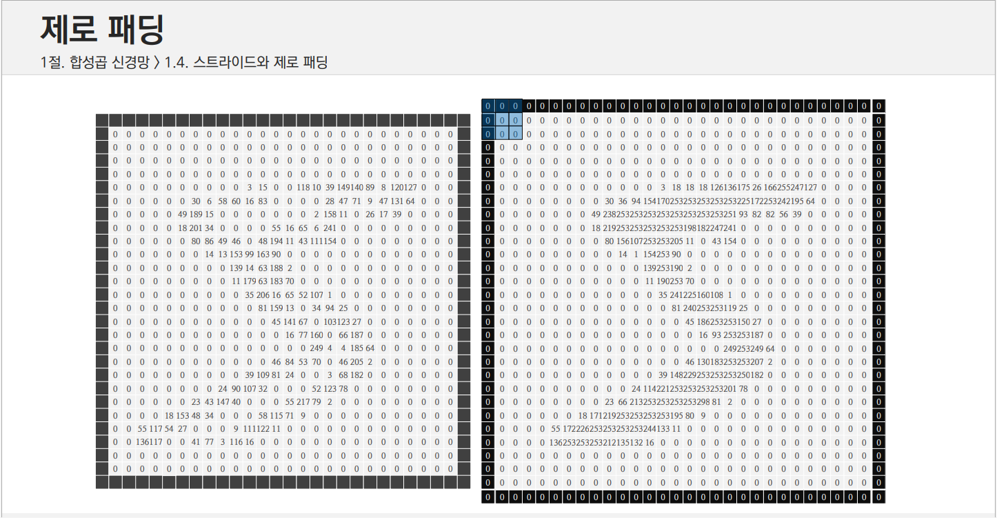 - 합성곱 연산 또는 풀링 연산 후 이미지의 크기가 작아질 수 있습니다. 예를 들어 합성곱 연산의 경우 필터 커널의 크기에 따라 원본 이미지의 바깥 테두리가 무조건 0으로 채워질 수 있습니다. 그렇게 되면 필터 커널을 적용한 후의 이미지의 크기가 줄어들어 데이터 손실이 있을 수 있습니다.