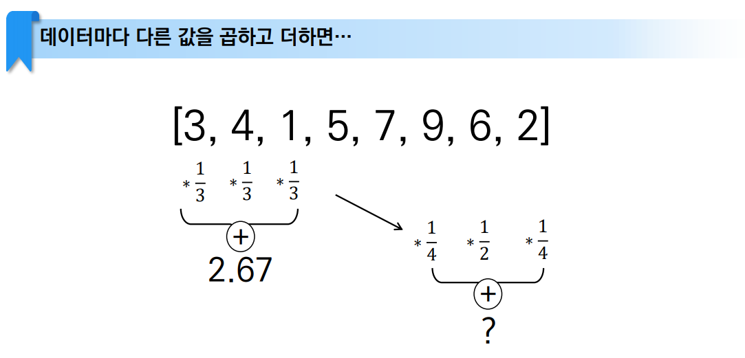 - 데이터를 따라가며 평균을 구할 때 데이터마다 같은 가중치를 주지 않을 수 있습니다. 다음 그림처럼 현재 주목하는 데이터에는 1/2의 가중치를 주고 그 앞/뒤 데이터에는 1/4 가중치를 주고 평균을 구할 수 있습니다.